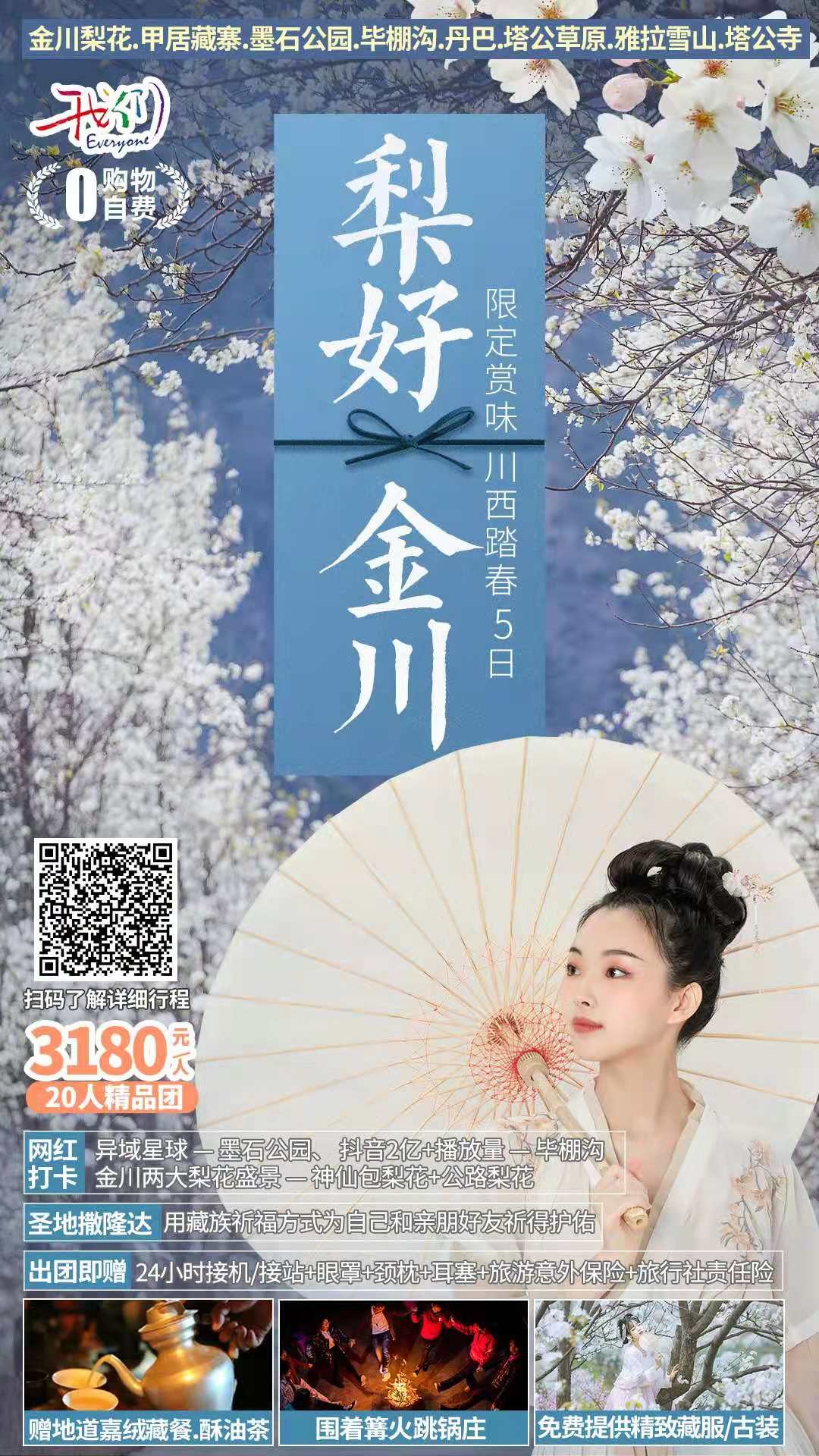 我們的團(tuán)期是金川最好的時(shí)節(jié),萬(wàn)物復(fù)蘇的初春三月,正值金川成千上萬(wàn)棵梨樹(shù)花期,雪白色的梨花競(jìng)相開(kāi)放,一片片、一層層的鋪散開(kāi)來(lái),漫山遍野的白色花海中夾雜零星新綠,空氣中氤氳著梨花清香,眼是天堂,身亦是天堂。