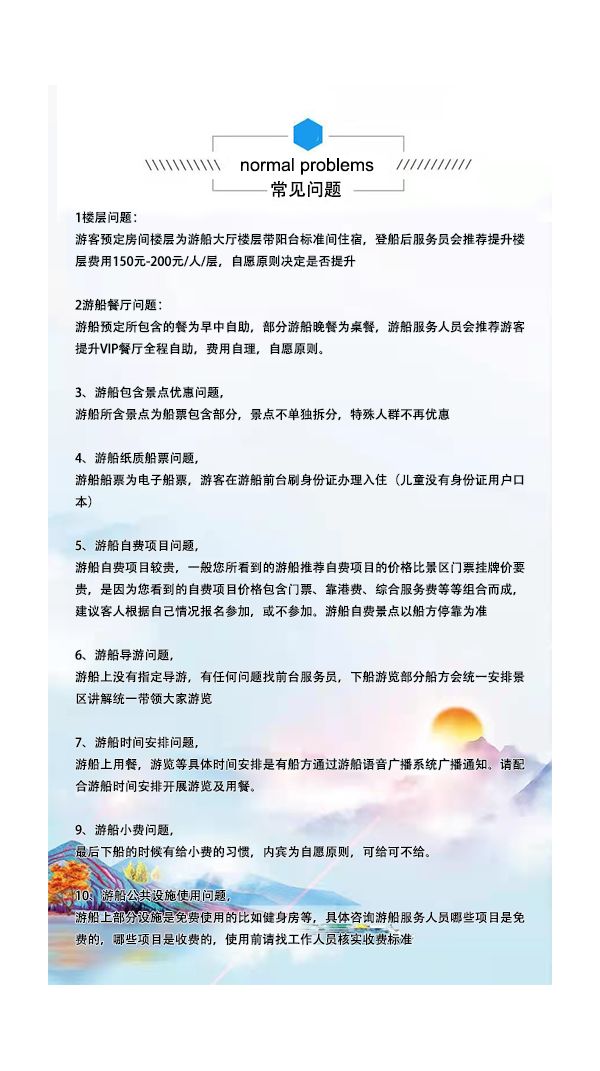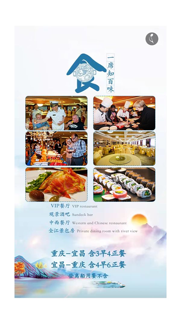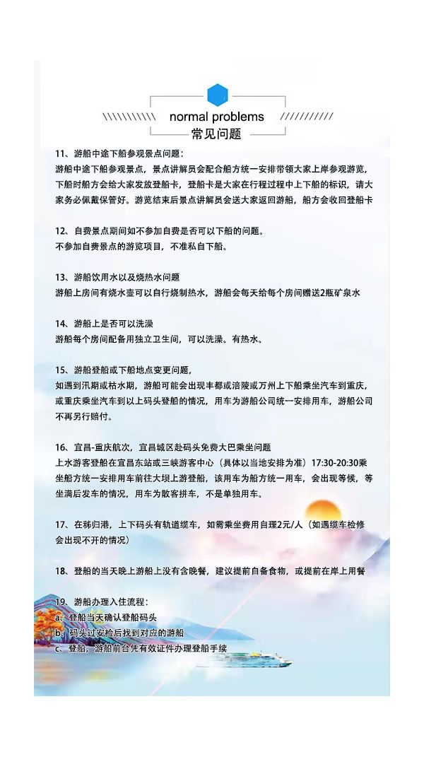 18:00——交通自行前往朝天門碼頭或集合地點(diǎn),登船時(shí)間問題:在重慶朝天門碼頭常規(guī)登船時(shí)間為17:00--20:00,請游客帶好本人身份證原件,無身份證兒童請帶好戶口本的戶口頁,在指定碼頭登船到游船前臺(tái)辦理入住。