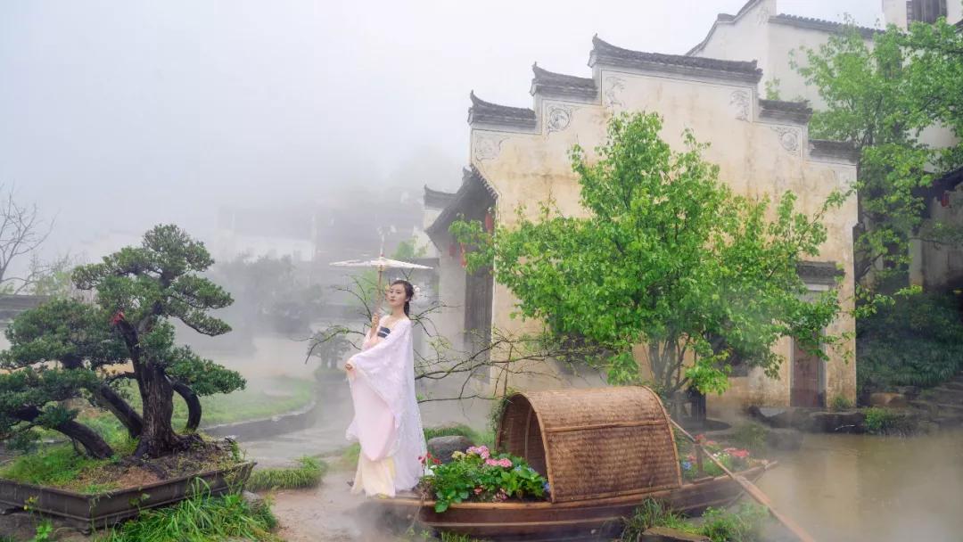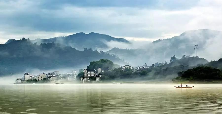 兩岸青山,青翠碧綠,形狀各異,江邊古色古香的徽州人家藏匿于青山中,粉墻黛瓦,煙霧裊裊。