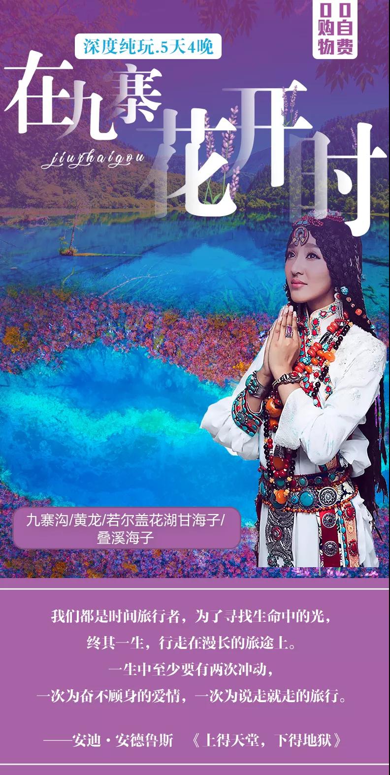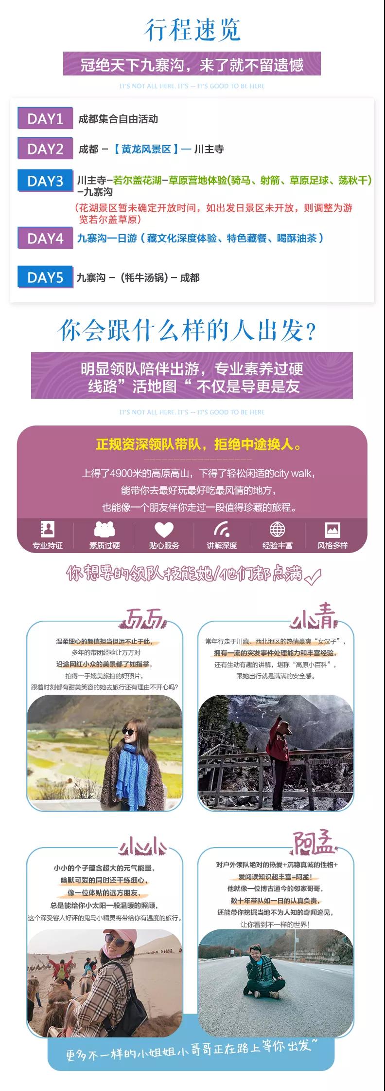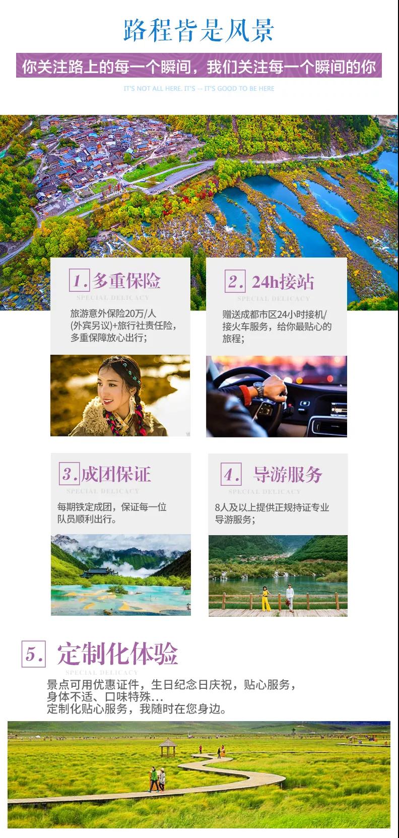 3、九寨溝面積較大游客需求不一,因此主要以游客自助游形式游覽,如無導(dǎo)游陪同望您諒解。游覽開始前導(dǎo)游會與您約定好集合時間,請務(wù)必按時到達(dá)指定地點(diǎn),避免耽誤大家接下來的行程;