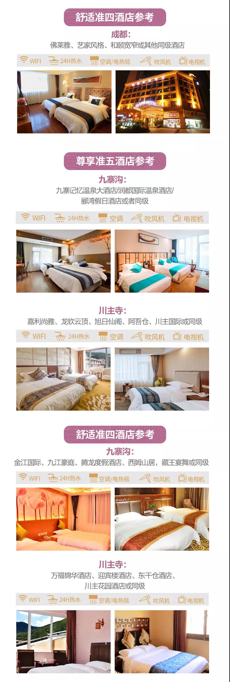 尊享準(zhǔn)五:九寨記憶溫泉大酒店,潤都國際溫泉酒店,酈灣假日酒店或者同級酒店。