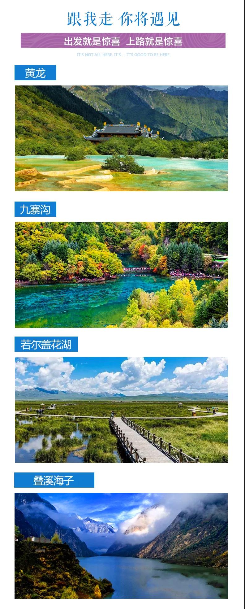 九寨溝門票、黃龍風(fēng)景區(qū)門票、若爾蓋花湖門票(花湖景區(qū)暫未確定開放時間,如出發(fā)日景區(qū)未開放,則調(diào)整為游覽若爾蓋草原);