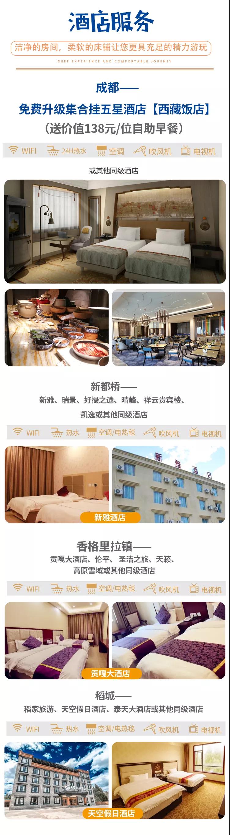 住宿:含全程6天5晚舒適酒店;免費(fèi)升級出行前成都集合掛五酒店西藏飯店一晚。參考酒店如下(僅供參考,實(shí)際以訂房為準(zhǔn)):