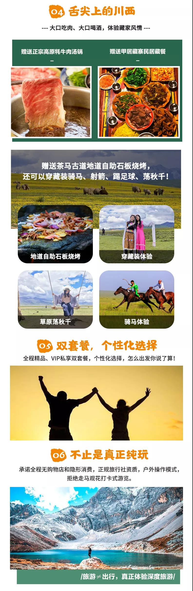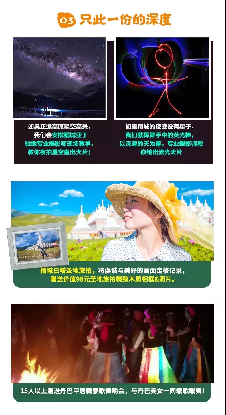 贈(zèng)送:特色贈(zèng)送甲居藏寨藏家晚餐、高原特色牦牛湯鍋、理塘茶馬古道自助石板燒烤;贈(zèng)送旅游三寶、魔術(shù)頭巾、礦泉水緩解旅途疲勞;贈(zèng)送價(jià)值98元圣地旅拍精致木質(zhì)相框&照片;贈(zèng)送稻城專業(yè)攝影師現(xiàn)場(chǎng)教學(xué)夜拍星空直出大片,沒有星星時(shí)則教拍流光大片;15人以上贈(zèng)送甲居藏寨篝火晚會(huì);贈(zèng)送成都市區(qū)24小時(shí)接機(jī)/接火車服務(wù);贈(zèng)送項(xiàng)目不用不退。