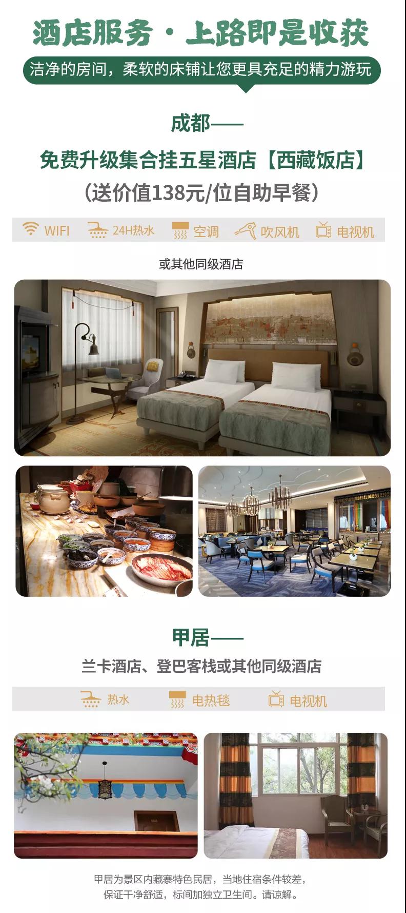 住宿:6晚當(dāng)?shù)鼐肪频觌p人標(biāo)間+免費(fèi)升級(jí)一晚成都集合掛五酒店雙人標(biāo)間,確保酒店干凈衛(wèi)生,溫馨舒適。因沿途高原藏區(qū)條件有限,如果酒店設(shè)施沒有達(dá)到您的期望,敬請(qǐng)諒解。參考酒店如下: