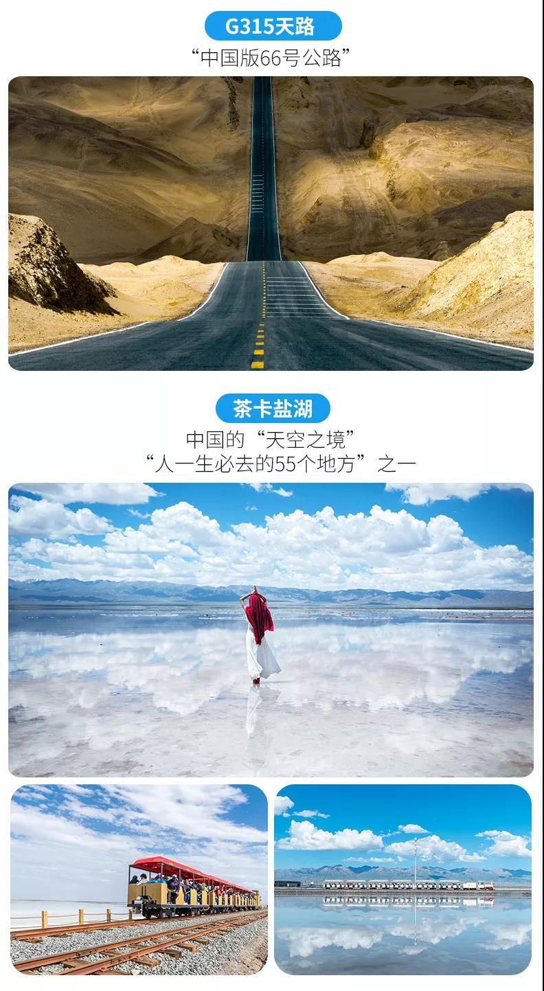 游覽過人跡罕至的茫崖翡翠湖,今天我們就去打卡炙手可熱的“天空之境”茶卡鹽湖。【茶卡鹽湖】被國家旅游地理雜志評為“人一生必去的55個地方”之一,這里的采鹽歷史非常悠久,湖水含鹽量很大,湖面上會自然結(jié)晶,一片純白。結(jié)晶之上是一層薄薄的露水,將天空、云朵和對岸的山都倒映在白色的湖里,非常漂亮,所以也被稱為“中國的天空之境”。大家可以乘坐景區(qū)內(nèi)的小火車前往景區(qū)深處游玩,如果不乘坐小火車,沿著鐵軌向湖深處散散步拍拍照片也是非常愜意的。