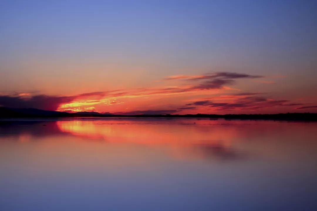 待日落時分,向西望,一團(tuán)赤球漸漸向湖面落去,將蔚藍(lán)的天燒出一方火紅晚霞,然后墜入溫柔冷清的青海湖,“落霞與孤鶩齊飛,秋水共長天一色”便是對此情此景最好的寫照,這湖水寬闊得將天地融化,將日月融化,將一切融化,融化在那滟滟湖波中。