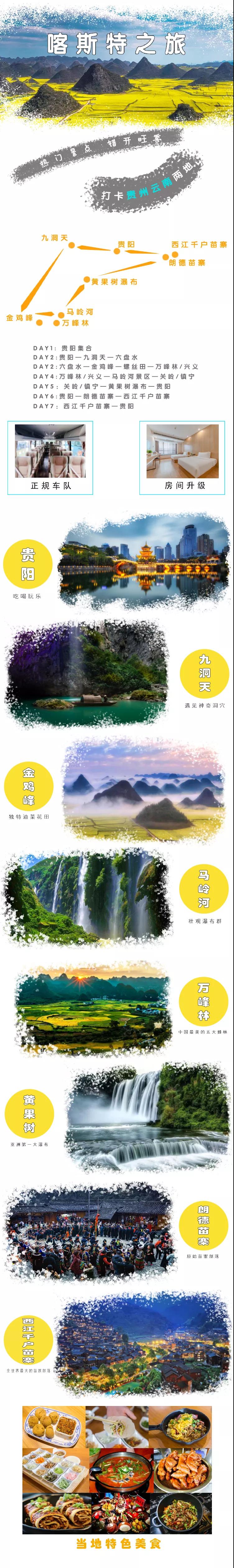 4. 門(mén)票:黃果樹(shù)門(mén)票及觀光車(chē)、西江千戶苗寨門(mén)票及觀光車(chē)、朗德門(mén)票及觀光車(chē)、馬嶺河+萬(wàn)峰林門(mén)票及觀光車(chē)、小火車(chē)(不含電梯)、九洞天門(mén)票及船票;