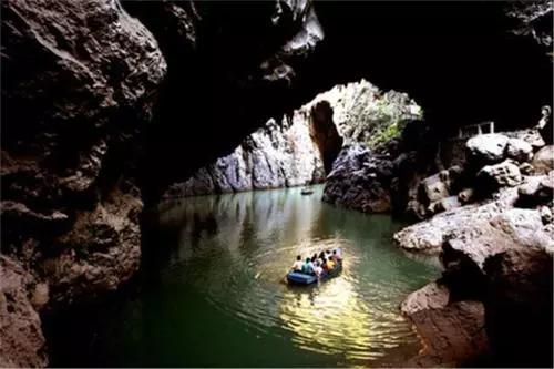 在這一段長(zhǎng)約2公里的六沖河河道上,箱形切割頂板 多處塌陷,形成了多個(gè)形狀、大小各異的天窗、天坑,是已發(fā)現(xiàn)的天窗天坑最密集的溶洞群,是可供乘船游覽最高大的溶洞群。