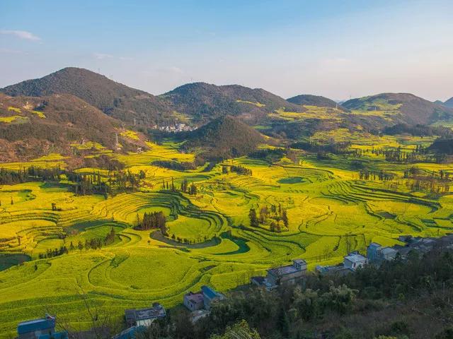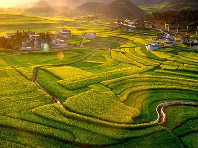 冬春季節(jié),長(zhǎng)滿油菜花的地塊金光燦爛,長(zhǎng)著小麥的地塊碧綠如玉;通過(guò)時(shí)候,沿著園周梯田一圈圈往上延伸的多是開(kāi)滿油菜花的,像無(wú)數(shù)金龍盤(pán)臥。還有的弓形、半園形的梯田,多的十幾級(jí)、少的三四級(jí),而且各種形狀相鑲,其間隔有一兩塊裝滿水的閑田如明鏡置于其中,一排排翠綠的樹(shù)點(diǎn)綴,形成了色彩鮮明、線條優(yōu)美、奇妙無(wú)比的美景。
