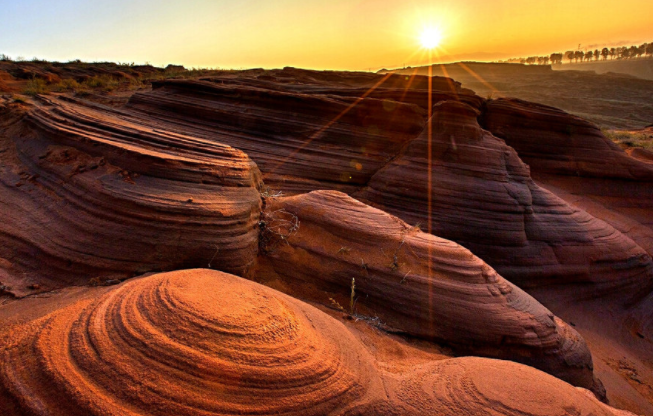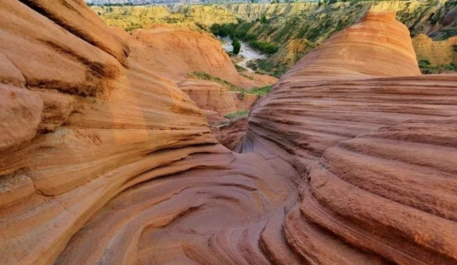 波浪谷展示的是由數百萬年的風、水和時間雕琢砂巖而成的奇妙世界。層層疊疊的石頭就像一大批鋪蓋在地面上浸染過后晾曬的紅色布匹,一層層、一卷卷、一盤盤在夕陽的渲染之下,異常的鮮紅; 與溝底一處處流淌細小的河水和遠處覆滿綠色植被山頂上轉動的風車構成了一幅優(yōu)美的實景畫。