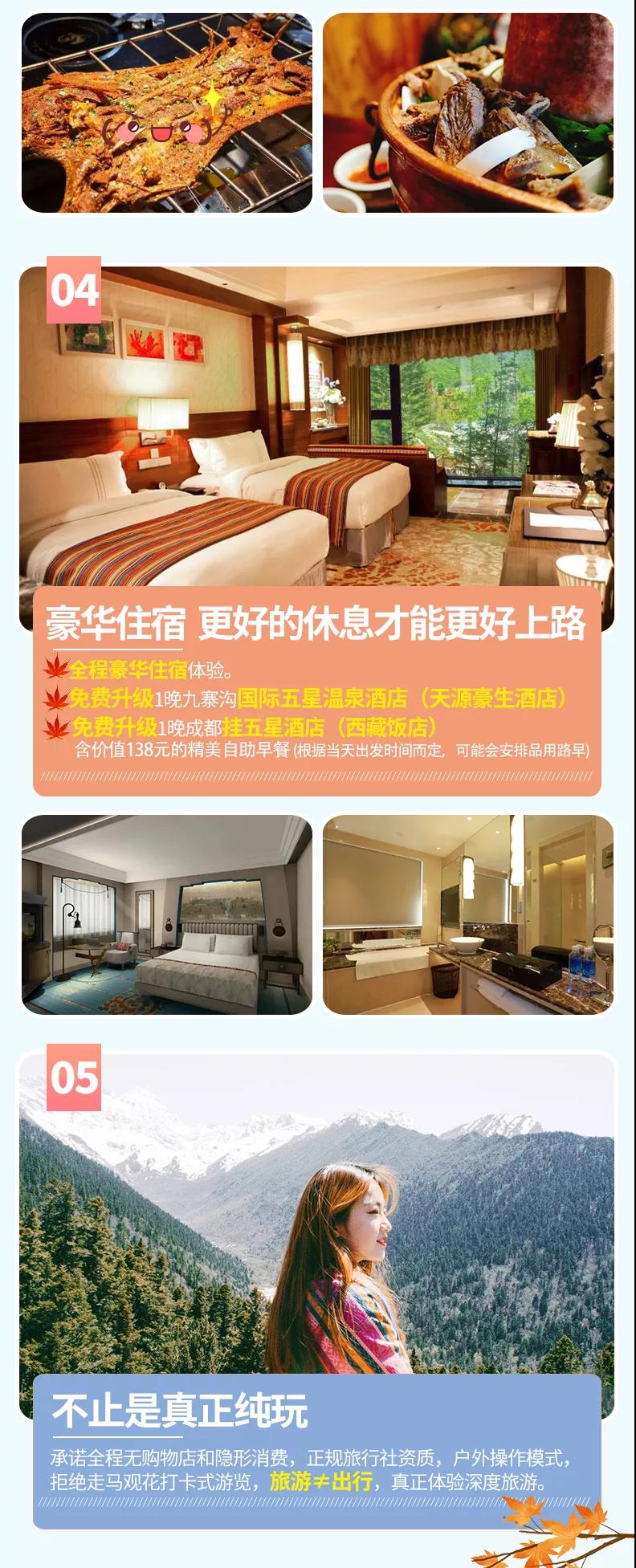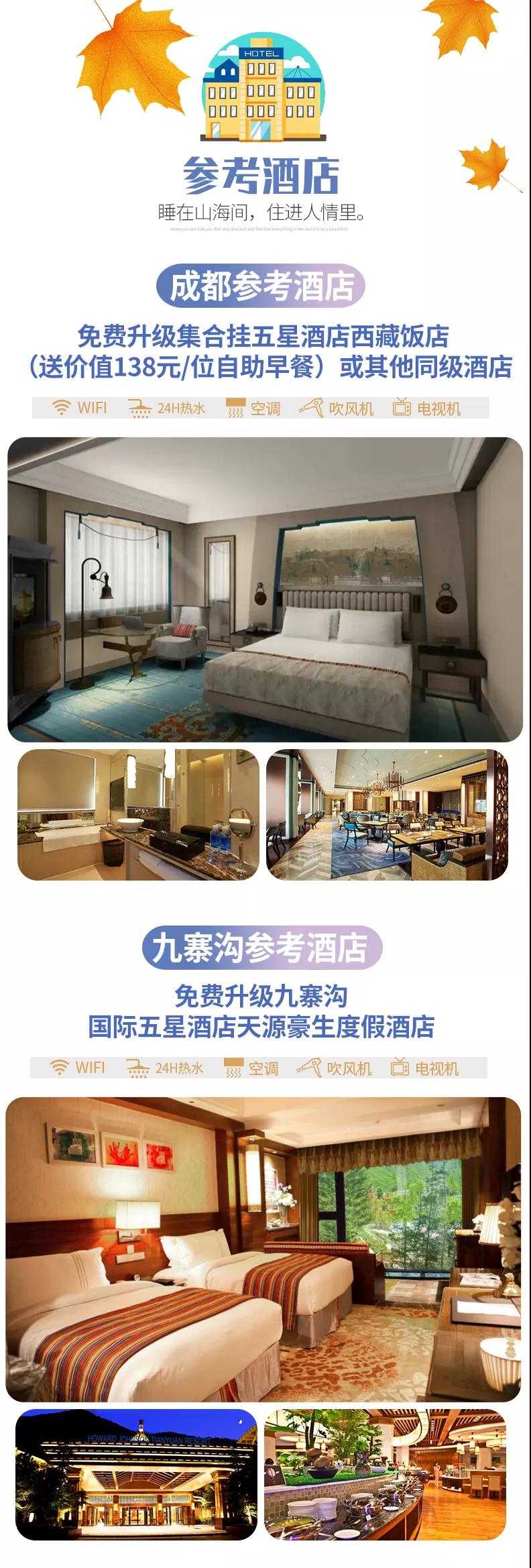 含全程4晚豪華酒店,免費(fèi)升級(jí)1晚成都掛五星酒店、九寨溝1晚國(guó)際五星酒店。參考酒店如下: