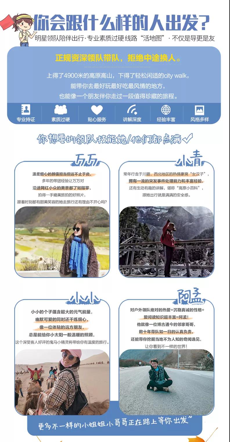私人訂制:我們業(yè)務(wù)范圍囊括了全國(guó)各大城市,川西、西北、東北,在路上永遠(yuǎn)有我們的身影。我們將為每一個(gè)有定制需求的你策劃出獨(dú)屬于自己的完美旅行。