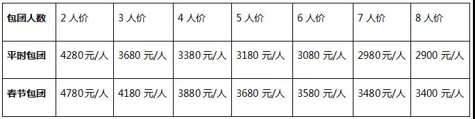 包團(tuán)報(bào)價(jià)均按2人入住1標(biāo)間核算,如出現(xiàn)單人,平時(shí)需另補(bǔ)房差700元/人,春節(jié)需另補(bǔ)房差900元/人。