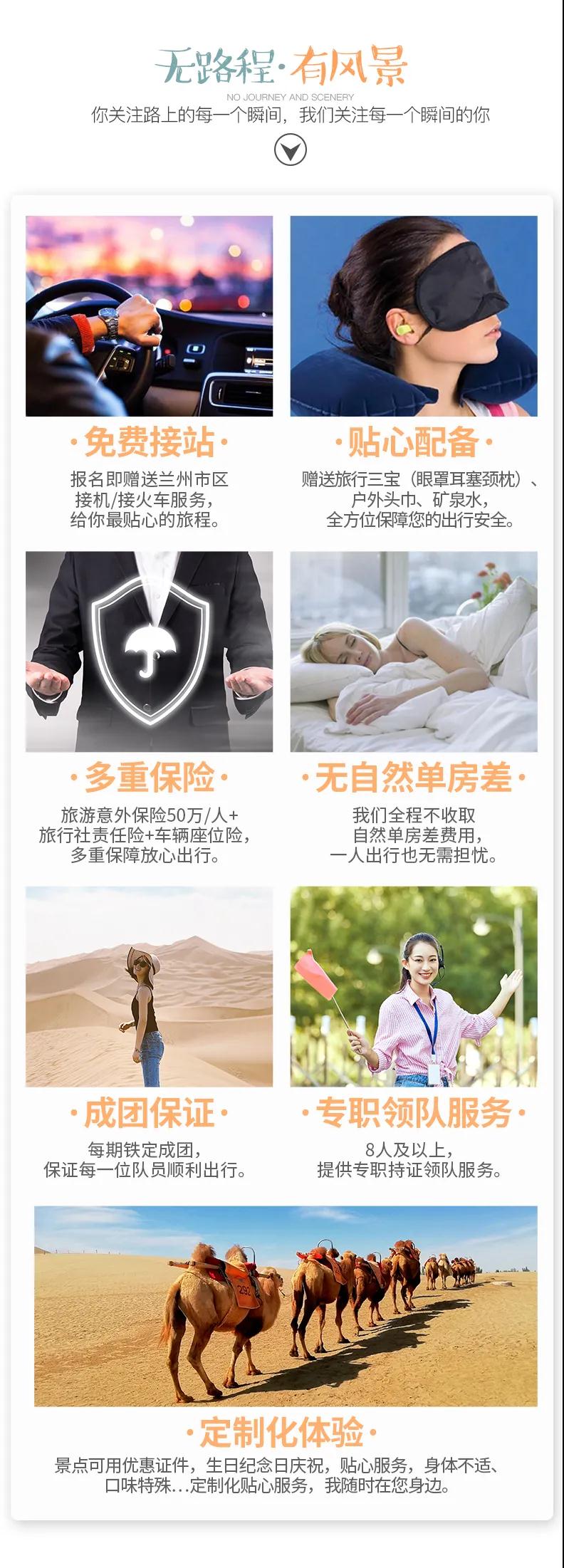 1. 敦煌莫高窟景區(qū)自2015年6月起實(shí)行數(shù)字展示中心數(shù)字洞窟展示和莫高窟實(shí)體洞窟體驗(yàn)的預(yù)約參觀(guān)模式,每天限6000人參觀(guān),團(tuán)隊(duì)參觀(guān)時(shí)間嚴(yán)格按照莫高窟預(yù)約場(chǎng)次進(jìn)行,因此,敦煌段景點(diǎn)參觀(guān)順序會(huì)根據(jù)莫高窟時(shí)間進(jìn)行調(diào)整或同團(tuán)客人安排不同時(shí)間游覽,敬請(qǐng)配合。