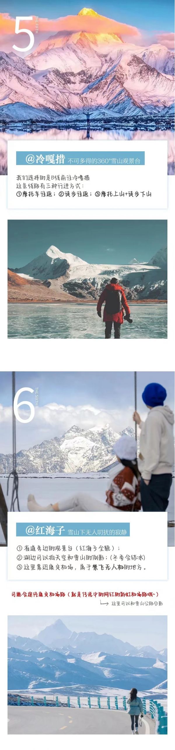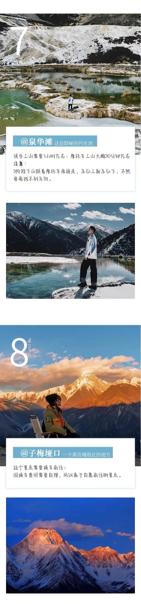 早餐后出發(fā),前往冷嘎措, 徒步時間步 2-3 小時(可選擇騎馬單面 200,或者摩托車往返200,費用自理),到達冷嘎措自由拍攝大片( 海拔4500 左右,切記帶上厚外套, 以及帽子圍巾墨鏡,冷噶措風(fēng)大溫度低,以防感冒高反), 觀貢嘎雪山、藍冰(藍冰根據(jù)溫度決定)然后下撤返回(冬季若遇大雪下撤時間根據(jù)實際情況安排),返回途中可以繼續(xù)前往泉華灘進行游玩。晚上入住上木居。