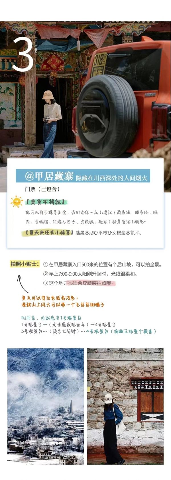 甲居藏寨 - 雅拉雪山觀景臺 - 墨石公園 - 塔公草原 - 魚子西 - 新都橋鎮(zhèn)