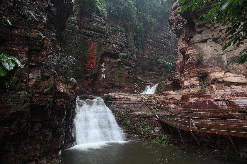 五連瀑水從西南峽谷中流出,形成五級連環(huán)瀑布。五連瀑的瀑布下有洞,人稱遇仙洞。傳說東漢永平年間劉晨和阮肇就是從這里被仙女接引到洞中的。