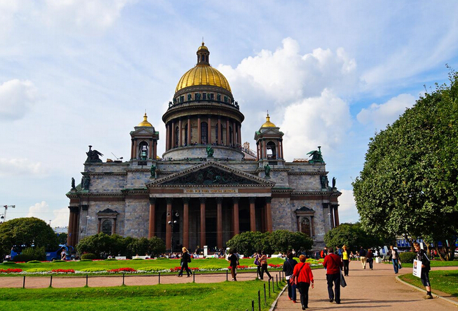 今天部分拍攝點包括夏宮花園,瓦西里島以及十二月黨人廣場。【圣伊撒基耶夫大教堂】(外觀約10分鐘)也叫圣伊薩基輔大教堂,始建于1707年,已有300年歷史。廳和殿皆以大理石裝飾,且有以貴重的藍、綠孔雀石材質建成的立柱,美不勝收。被認為是僅次于羅馬梵蒂岡圣彼得大教堂、德國科隆大教堂的世界第三大教堂。伊薩基耶夫教堂,是圣彼得堡的象征。晚餐后入住酒店休息。交通:巴士