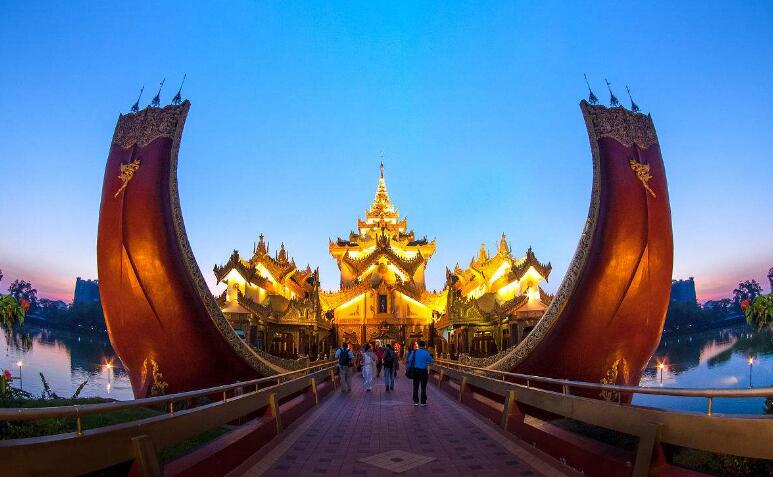 早餐后,返回仰光,參觀:世界各國佛教徒第六次大會開會地點、能容納萬人的【摩哈巴沙納石窟道場】及【世界和平塔】,參觀仰光最大的【巧塔基六層臥佛】、【摩哈班都拉花園獨立紀念碑】、【殖民時代建筑物】等,傍晚游覽著名的【瑞德貢大金塔】,此塔是仰光市的地標,始建于2500年前,塔頂及塔身以7噸黃金覆蓋,頂上金質寶傘下有一直徑27公分的黃金鉆石球,球面鑲有鉆石和各色寶石多達7000余顆,塔周環(huán)立68座各式小金塔,簇擁著大塔而形成金塔之林,尤其夕陽西下時場面十分壯觀富麗。晚上前往南帝達碼頭,在【格拉威皇家船餐廳用自助晚餐】并觀賞【緬甸民族歌舞表演】。