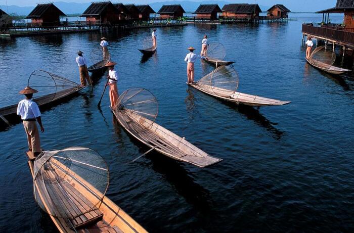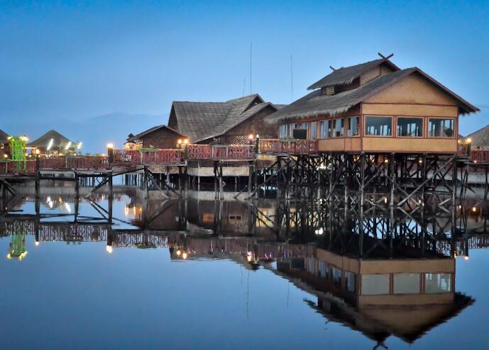 飯店內早餐后,乘坐當地特色游船游覽風光旖旎的茵萊湖。茵萊湖是緬甸第二大湖,三面環(huán)山,水質清澈,湖底水草清晰可見,湖水的顏色隨著每天日出日落而發(fā)生變化。當地茵達族人的村寨依湖而建,高腳屋、學校、商店等各種生活設施均佇立水中,當地人的飲食起居均依湖而生,交通往來全依靠船只,是名副其實的水上村寨。當地人特有的劃船方式是站在船尾,手腳并用的劃船。乘船參觀坐落在湖上的【水中佛塔】,在此可以欣賞俗稱【貓?zhí)?/strong>】的【波道烏寺】中的緬甸貓在寺中僧人的訓練下,可以為游人表演鉆圈,寺中的五世佛像是艷麗湖的至尊,寺中的佛塔金光燦燦,全寺全部由柚木建成,木雕技藝精湛,其本身就是一座藝術寶庫;參觀水上【手工織布制衣作坊】、【卷煙作坊】、【鐵器生產作坊】,與【長頸族家庭】拍照,參觀當地每周一次的集市【水上市場】,領略緬甸獨特的水上村寨生活。午餐在風光奇美的【水上餐廳】用餐,品嘗湖中的特產魚。晚入住水邊的木屋別墅。