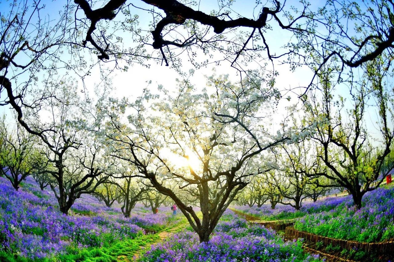 4、春季梨花盛開(kāi)的季節(jié),這里是一片冰清玉潔的世界,白色的梨花紫色的二月蘭,一望無(wú)際的白紫交融的——梨蘭會(huì);