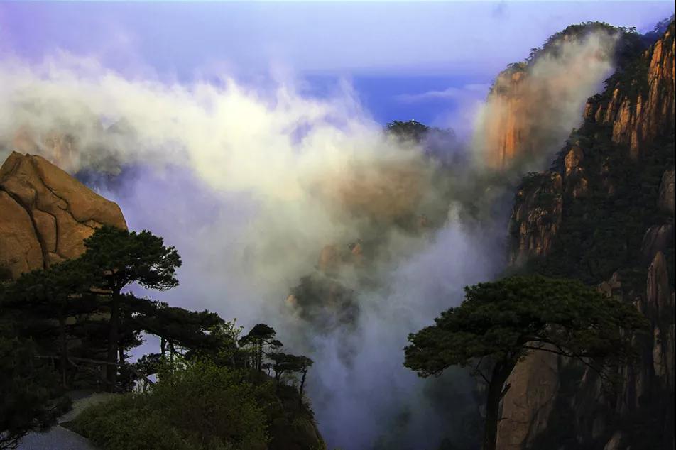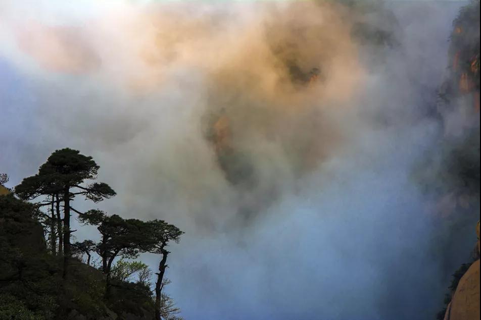 山間云海翻滾,變幻莫測;奇峰危崖,變成了一座座蓬萊仙山,方嘆峰巒骨骼清奇,轉(zhuǎn)瞬又消失于云霧中,動(dòng)如脫兔,靜如處子,動(dòng)靜變幻,神奇詭秘......目不暇接,流連忘返。