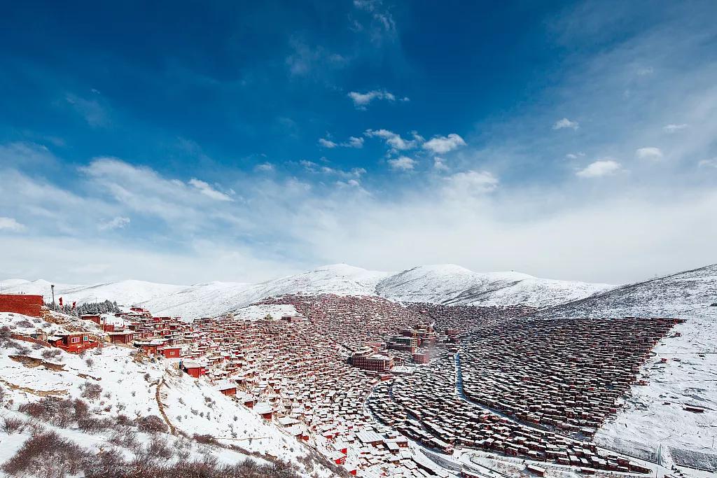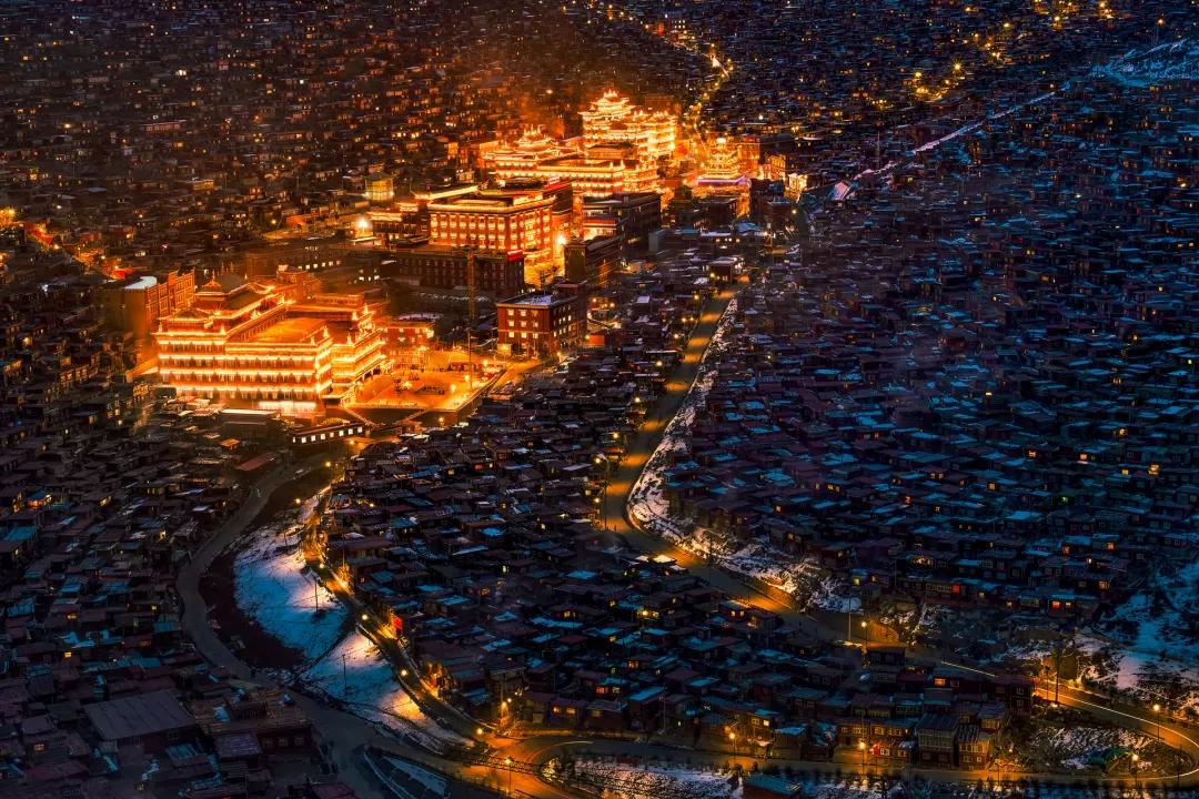 之后到達洛若鎮(zhèn),穿過塔林進入五明佛學院,震撼的佛國畫卷漸漸呈現在眼前--入目處盡是朱紅的佛色,裹著紅袍的僧人在其間穿行,空氣里彌漫著佛香;