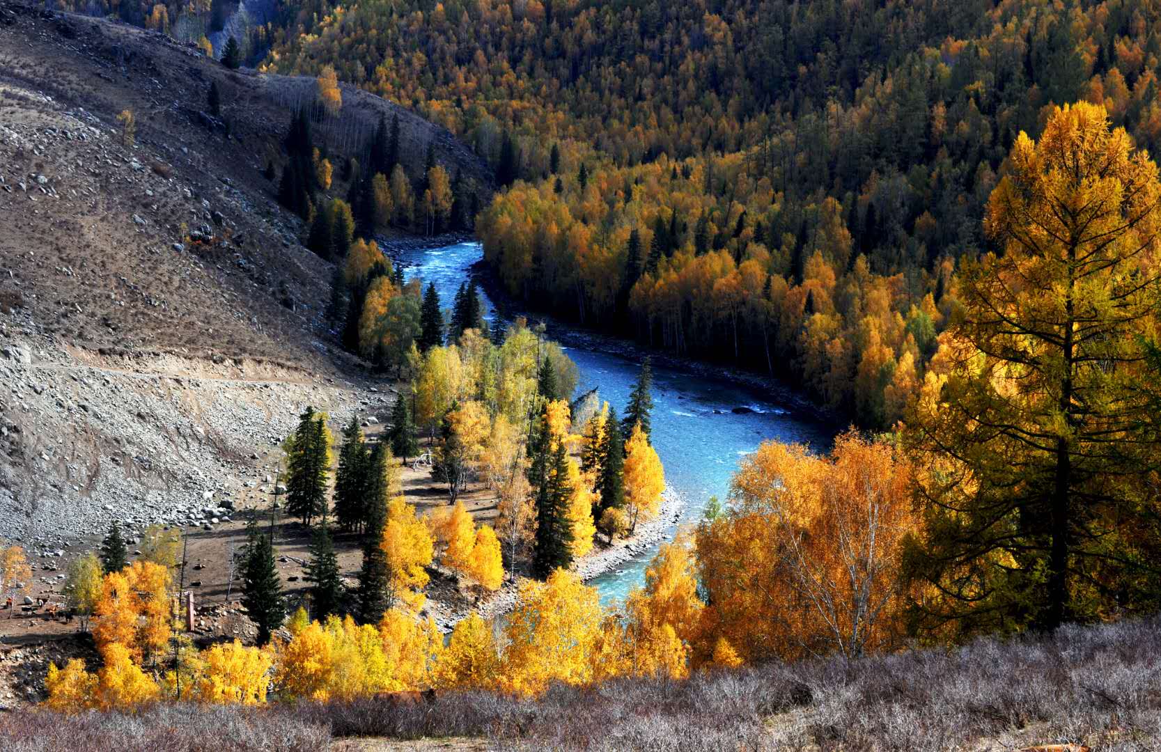 【禾木景區(qū)】(含區(qū)間車,游覽2.5--3小時)白樺林腳下的禾木河水在陽光下閃爍金光,與木屋、炊煙、擠牛奶的牧民,以及牧羊的孩童一起,營造著家園的溫馨,釋放著一種生命獨有的暖意。吹著風(fēng),看著雪山,享受星空和大地帶給您最好的旅行?;蝌T馬在圖瓦人村落中漫步,享受牧民的田園牧歌??δ撬箙^(qū)域最美的景色在禾木,層林浸染,絢麗多彩,是一處典型的原始自然生態(tài)風(fēng)光。在禾木村周圍的小山坡上可俯視禾木村以及禾木河的全景,一棟棟的小木屋和成群結(jié)隊的牧群,與雪峰、森林、草地、藍(lán)天白云構(gòu)成了獨特的自然與文化景觀。