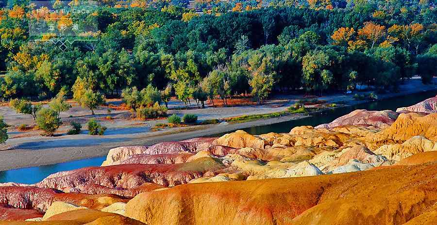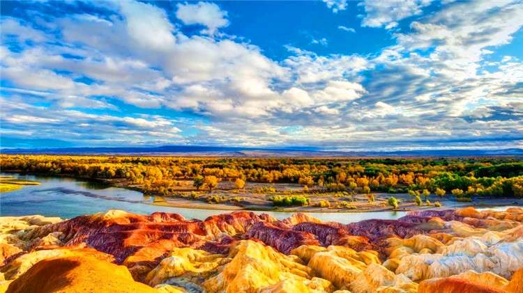 【五彩灘】(游覽時間60分鐘)五彩灘位于新疆北部,五彩灘又名五彩河岸,我國唯一的一條注入北冰洋的河流。五彩灘地貌特殊, 山勢起伏、顏色多變,其是由激猛的流河侵蝕切割以及狂風(fēng)侵蝕作用而共同形成。由于河岸巖層間抗風(fēng)化能力的強(qiáng)弱程度不一而形成了參差不齊的輪廓,這里的巖石顏色多變,且在陽光照射下,巖石的色彩以紅色為主,間以綠、紫、黃、白、黑及過渡色彩,色彩斑斕、嬌艷嫵媚,因此被稱作“五彩河岸”、是“新疆最美的雅丹地貌”。