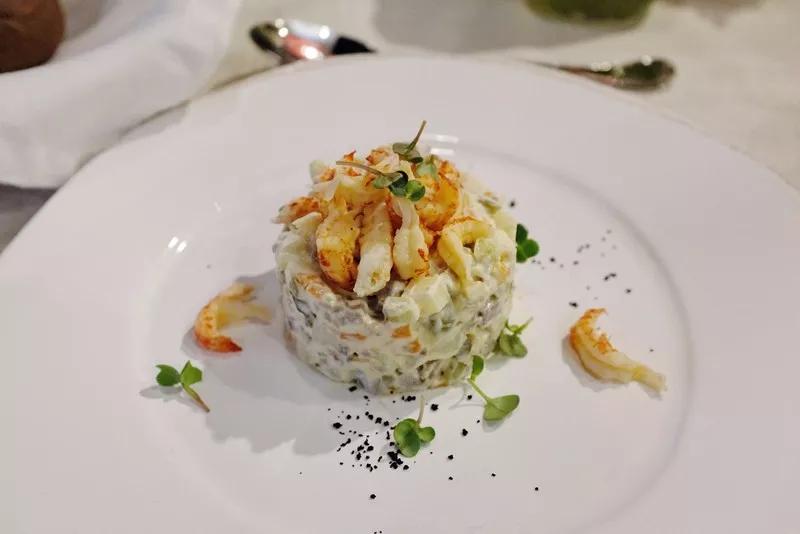 一頓完整的俄式料理,構成上跟西餐差不多,包括前菜(沙拉)、湯、主菜、甜品等,菜是一盤盤上桌。大家習慣于認為這種用餐順序和餐桌禮儀是純法式的,事實上,直到19世紀初,主流的法式服務就像中餐一樣,所有的菜式一齊上桌。直到后來,沙皇俄國駐巴黎大使極力推廣一盤盤上菜的俄式服務,希望料理在最美味的狀態(tài)下提供給顧客,舊的法式服務才被淘汰,甚至連帶給法國料理帶來了一次革新。事實上,俄式服務才是西餐儀式感的鼻祖。