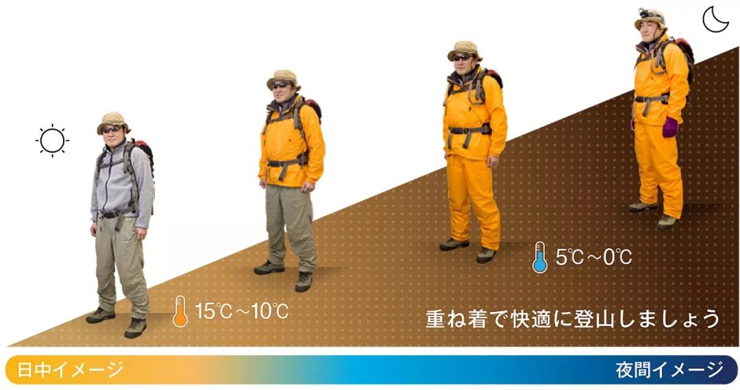 富士山是日本第一高峰,即使在盛夏,山頂?shù)捏w感溫度有時(shí)也在零度以下。當(dāng)攀登富士山超過3000米時(shí),天氣可能會迅速變化,甚至可能造成下山延遲。所以出發(fā)前一定要檢查自己的裝備,尤其是較舊的裝備有沒有存在損壞。為了能夠安全舒適地登山,請準(zhǔn)備好以下裝備。