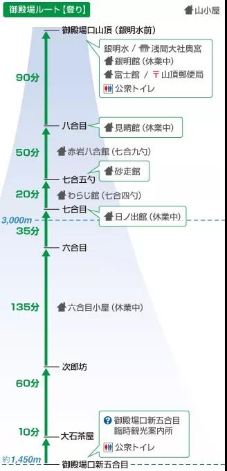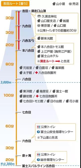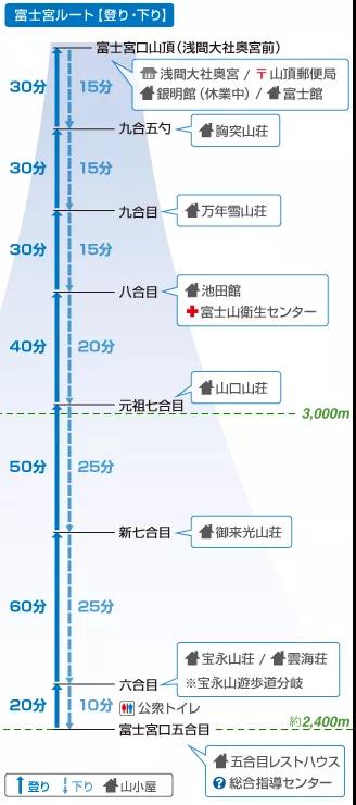 登山道和下山道完全一致,整個(gè)路線有很多巖石地,山坡比較陡峭。每個(gè)合目都有山間小屋,在八合目設(shè)置有救護(hù)所,五合目有商店和食堂等,可以購買水或簡單的裝備,進(jìn)行休息。