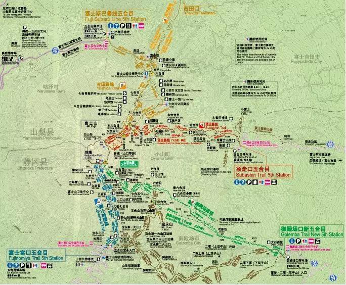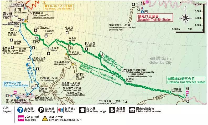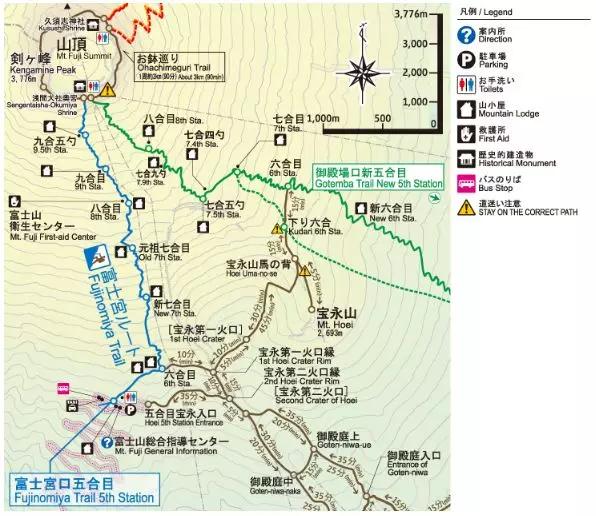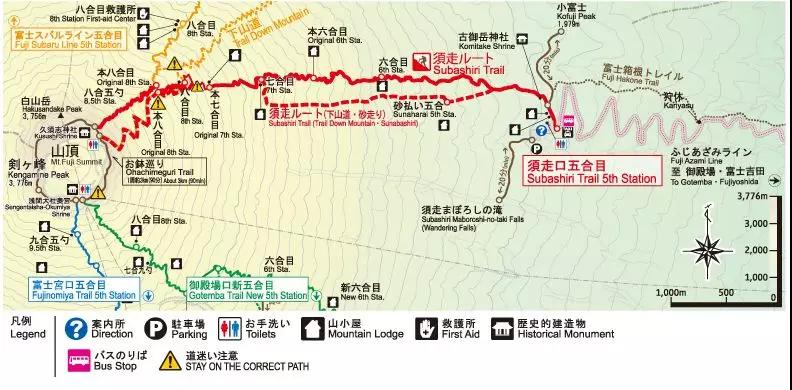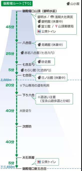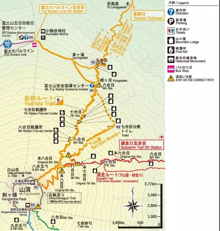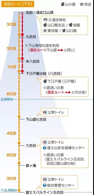 登山道跟下山道除了七合目以上的地方,其余都是不同的。山路上山小屋很少,多位于七合目附近,要自己備好比較充分的水和干糧。除此之外,也沒有救護(hù)所。