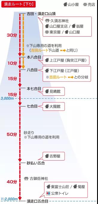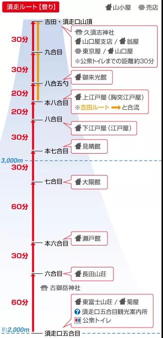 登山道跟下山道是完全分開的,登山道有很多山間小屋可以休息,而下山道就幾乎沒有小屋。在五合目、七合目和八合目分別建有救護(hù)所。商店也是最多的,食堂、休息室、旅館都有,登山的便利性最好。