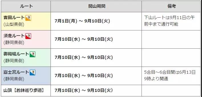 雖然通常都是7月上旬就開放登山道了,但7月初日本梅雨季還未過,所以最好等到梅雨過去的一兩個(gè)星期,即7月20日以后攀登為宜。那時(shí)候天氣晴朗,是到山頂觀日出的最佳時(shí)節(jié)。