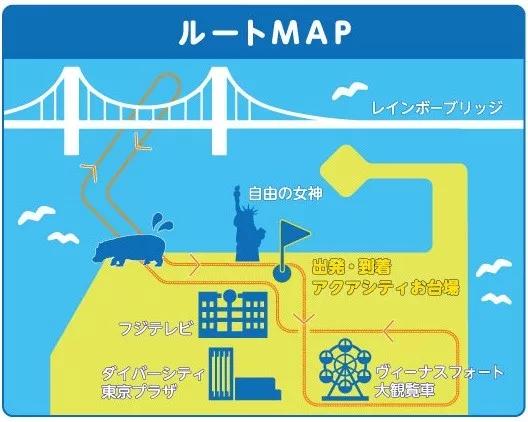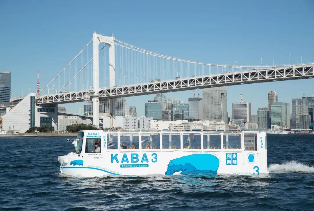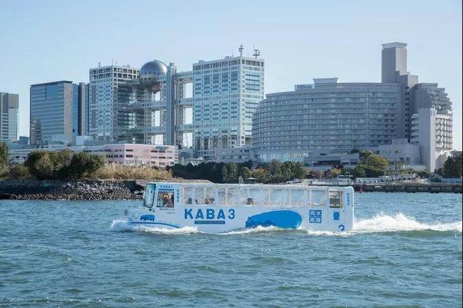 水陸兩用巴士TOKYO NO KABA,全長(zhǎng)約12m,從臺(tái)場(chǎng)AQUA CITY的巴士站出發(fā),一天有7班,每周三休息。該巴士可供38名游客乘坐,可以坐在上面一邊吹著海風(fēng)一邊觀(guān)賞臺(tái)場(chǎng)的美景。需要提前一個(gè)月預(yù)約,如果當(dāng)天有空位,沒(méi)有預(yù)約也可以乘坐。