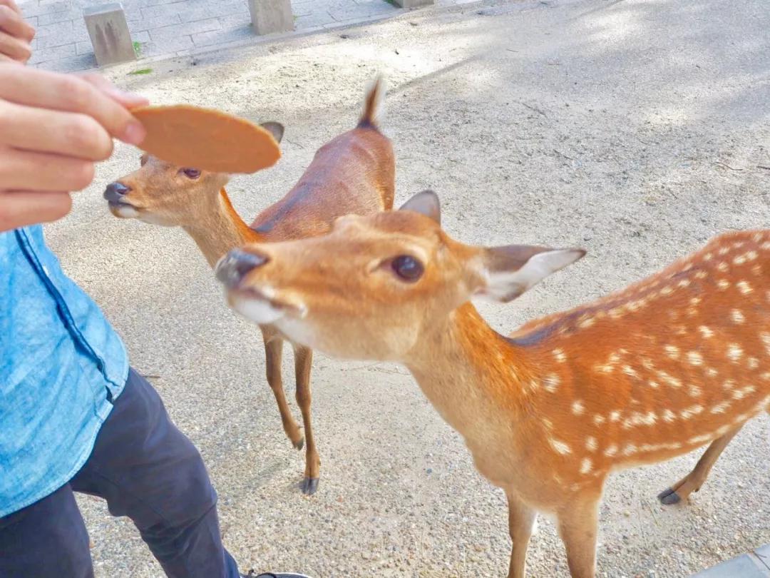 奈良公園里很多食品店向游客出售喂鹿的“餅干”。買好后只要“咯咯”一叫,就會有鹿聞聲而來,吃完之后,一頭頭鹿還會像懂事的孩子般,彬彬有禮地點頭離去,真的好有趣。