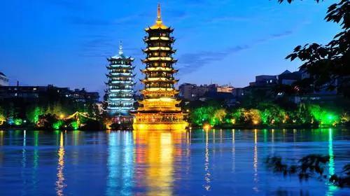 游覽新地標【日月雙塔】(登塔約40分鐘),座落在桂林城的中軸線上,與象山上的普賢塔、塔山上的壽佛塔,相互呼應,相互映襯,有“四塔同美”之說,是兩江四湖環(huán)城水系中最著名的旅游景點;