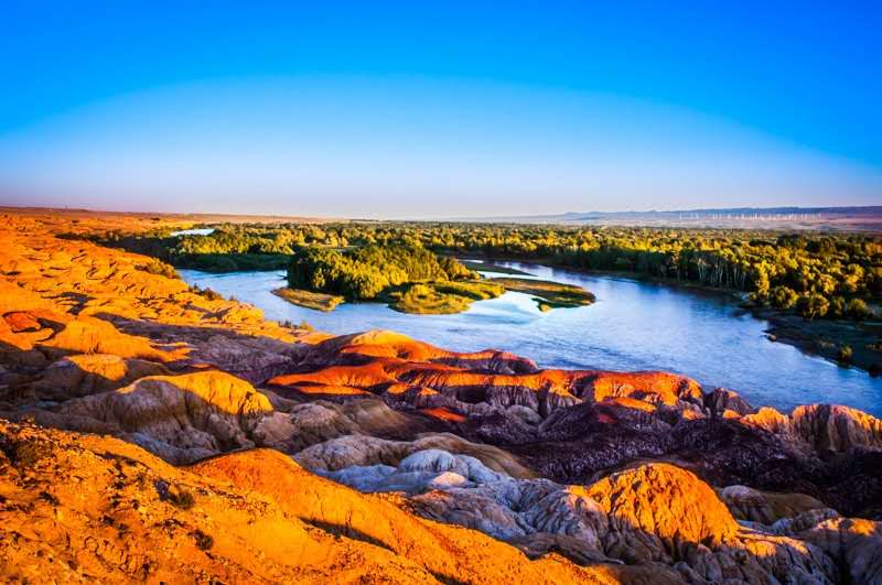 五彩灘風(fēng)景區(qū)前有大型的風(fēng)力發(fā)電網(wǎng)站。北岸山勢(shì)起伏、顏色多變,其是由激猛的流河侵蝕切割以及狂風(fēng)侵蝕作用而共同形成。由于河岸巖層間抗風(fēng)化能力的強(qiáng)弱程度不一而形成了參差不齊的輪廓,這里的巖石顏色多變,且在落日時(shí)分的陽光照射下,巖石的色彩以紅色為主,間以綠、紫、黃、白、黑及過渡色彩,色彩斑斕。每當(dāng)刮風(fēng)的時(shí)候,溝壑里、巖石下,到處都會(huì)發(fā)出長短不一、高低不同的怪叫聲。