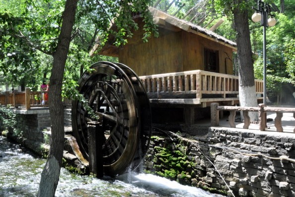 水磨河從龍口泉一直蜿蜒流淌到景區(qū)大門,河水清澈,兩岸綠樹成蔭,是整個水磨溝景區(qū)最靈動的部分。在靠近龍口泉的河邊,有座水磨坊,這是一座再現(xiàn)歷史景觀的仿古磨坊。據(jù)說,清乾隆年間,當?shù)毓俜胶兔耖g曾利用水磨溝的水力,在這里置辦水磨坊一百多間,為駐軍和居民加工食糧,水磨河和水磨溝也正因此得名,后來,隨著磨制工具的更新,原有的水磨坊逐漸絕跡?,F(xiàn)在看到的這座磨坊是1992年的仿古建筑。