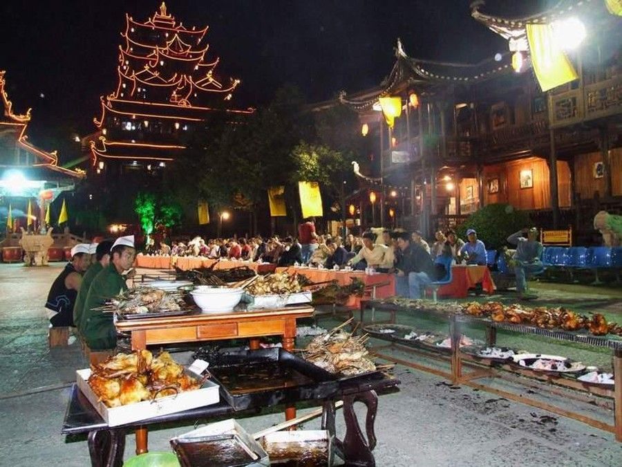 進(jìn)入土司城,首先看到土司城迎賓儀式,土家漢子迎賓鼓,吹牛角、放沖,土家姑娘攔門歌,敬攔門酒,進(jìn)入城內(nèi),在祭祀堂前舉行百人土家大祭祖活動(dòng),男女老少唱擺手歌、跳擺手舞,登世界最高的吊腳樓九重天,參觀土家族千百年來文化展示。到土家山寨,聽土家歌,賞土家族最有代表風(fēng)俗哭嫁,三棒鼓,花燈等民俗表演。