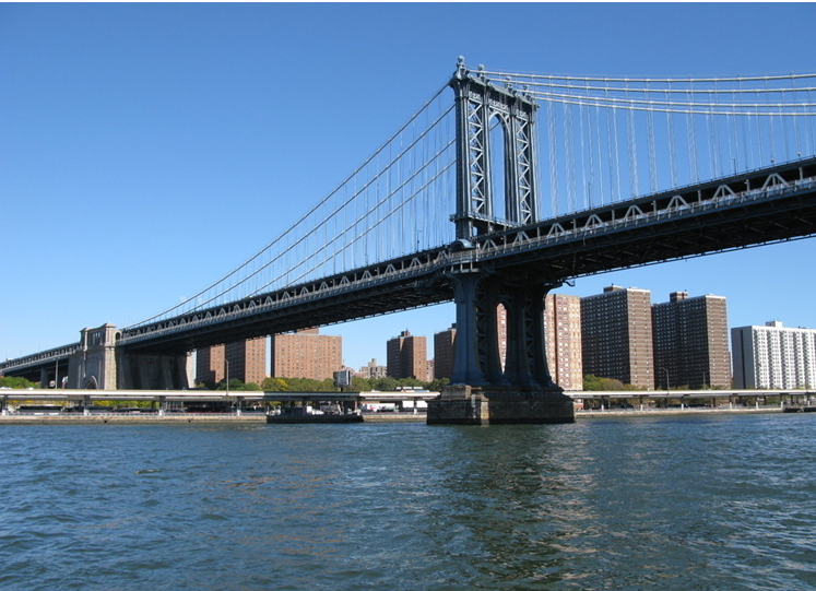 紐約的布魯克林大橋橫跨紐約東河,連接著布魯克林區(qū)和曼哈頓島,1883年5月24日正式交付使用。大橋全長1834米,橋身由上萬根鋼索吊離水面41米,是當(dāng)年世界上最長的懸索橋,也是世界上首次以鋼材建造的大橋,落成時被認(rèn)為是繼世界古代七大奇跡之后的第八大奇跡,被譽(yù)為工業(yè)革命時代全世界七個劃時代的建筑工程奇跡之一。