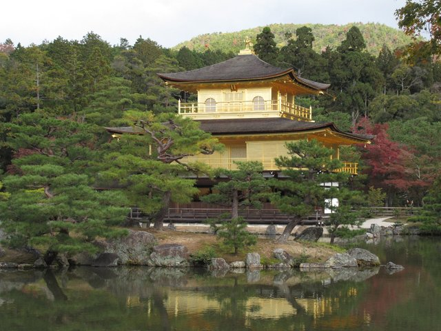 的南岸。屋頂是寶塔形狀,并有只銅制的鳳凰。雖然是3層建筑,但是由于一層和二層之間沒有做出屋頂的延伸,所以形式上是“二重三層”。一層沒有貼金箔而是用木頭制作,二層與三層的外面(包括圍欄)全部貼滿金箔。三層的內部也是全面貼滿了金箔(地板除外)。一層與二層的平面是同樣形狀和同樣大小的,正面5根柱,側面4根柱。一層與二層使用了貫通的柱子,使構造一體化。三層小了一圈,每邊3根柱。