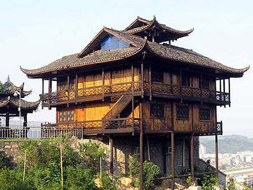 最基本的特點(diǎn)是正屋建在實(shí)地上,廂房除一邊靠在實(shí)地和正房相連,其余三邊皆懸空,靠柱子支撐。吊腳樓有很多好處,高懸地面既通風(fēng)干燥,又能防毒蛇、野獸,樓板下還可放雜物。吊腳樓還有鮮明的民族特色,優(yōu)雅的“絲檐”和寬綽的“走欄”使吊腳樓自成一格。這類吊腳樓比“欄桿”較成功地?cái)[脫了原始性,具有較高的文化層次,被稱為巴楚文化的“活化石”。