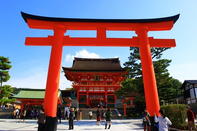 伏見稻荷大社一詞最早出自《日本書紀(jì)》(奈良時代所作之漢文編年體史書)。欽明天皇即位前的少年時代,曾做過這樣一個夢。書中描述道:“如登用秦之大津父者,吾成人之時,定能治天下?!焙芸?,使者被派出以尋找大津父。在和銅四年(711年)2月初午之日將秦(はたの)伊呂巨(具)供奉。秦(はたの)伊呂巨(具)即稻荷神。當(dāng)時諸蕃(渡來者(從他國來的人)及歸化系氏族(歸化日本之人))中約有三分之一的人屬秦氏。中國秦始皇十三世孫、即孝武王之子孫功德王對應(yīng)的仲哀天皇的統(tǒng)治時期,融通王對應(yīng)応神天皇的統(tǒng)治時期。當(dāng)時史書有載:“秦氏率一百二十七縣之人經(jīng)百濟歸化。”還有一說為五胡十六國時期,前秦之王族于戰(zhàn)亂之中,經(jīng)由朝鮮半島到達(dá)日本。這兩種說法今后尚需驗證。雄略天皇在位之時,有大批的渡來人進入日本。而為數(shù)眾多的秦氏族帶來了先進的絹織技術(shù),對于國家建設(shè)有很大的幫助,是以朝廷予以厚遇,有甚者,朝廷與之以畿內(nèi)(京都)豪族獨有的地位。就這樣,深草的秦氏族于和銅四年(711年)在稻荷山(現(xiàn)京都市伏見區(qū))的三峰之平坦處奉稻荷神,于京都盆地之中心立御神威赫之神像。