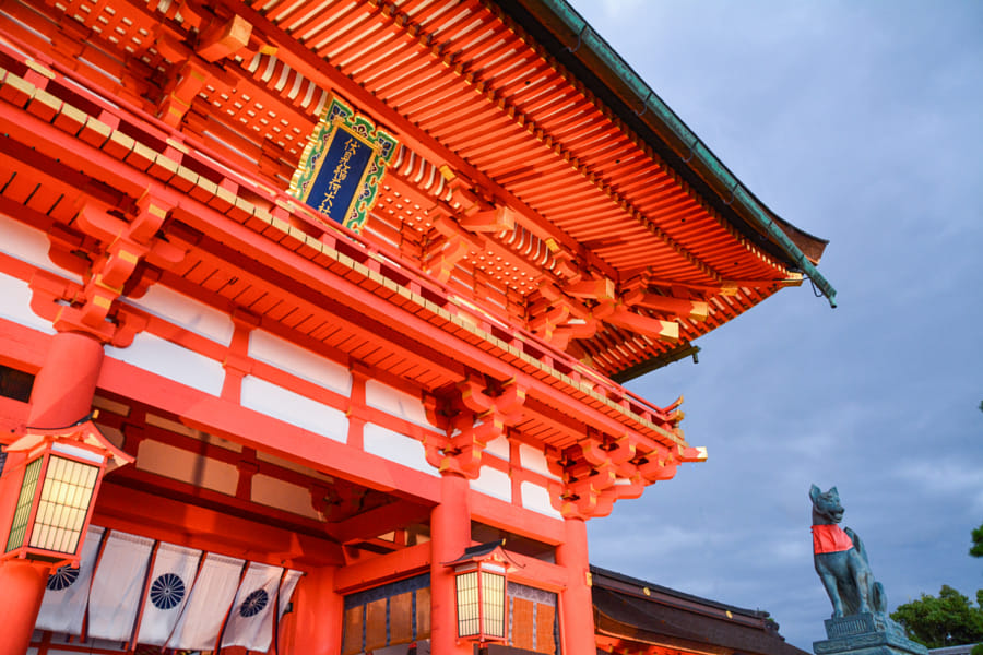 這里供奉的是保佑生意興隆,五谷豐登的神明,每到正月或每月1日趕集的日子,這里就熱鬧非凡,本殿與鳥居都是紅色的,代表萬物豐收秋天的色彩。穿過“千本鳥居”,就是稻荷神山的入口,從這里可登上稻荷山頂,山道兩旁布滿了紅色鳥居。