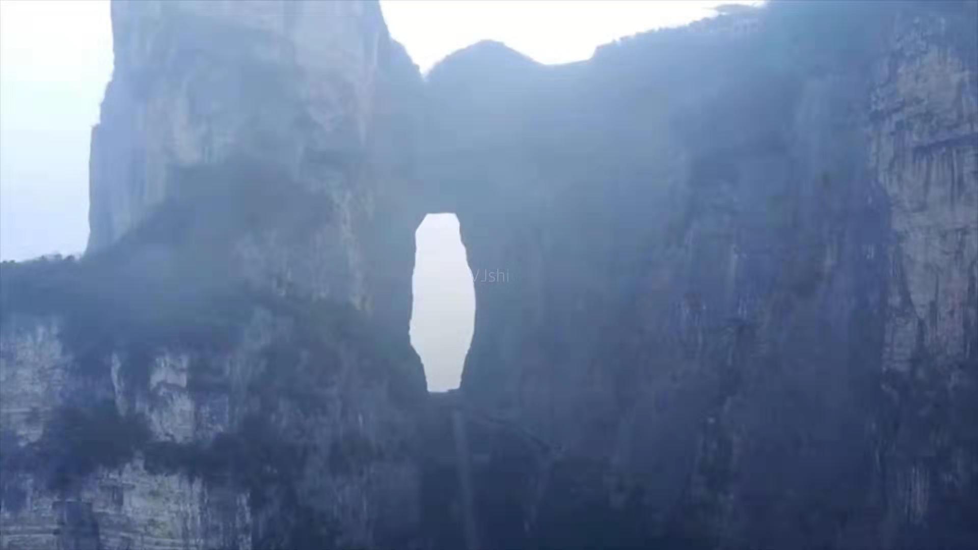 空曠而明朗,洞門(mén)前后的山峰,都很低,惟有此山獨(dú)尊。一洞空明,除悠悠白云,就是融融藍(lán)天,一塵不染。所以給1999年的飛機(jī)穿越此洞提供了絕好的條件。