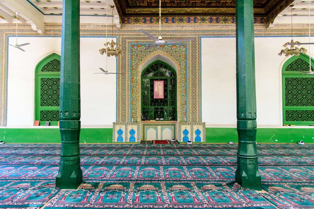 正殿的南墻和北墻各有兩扇門和一扇窗戶,正殿內(nèi)共有18根支柱,正殿的南北兩側(cè)是外殿,北側(cè)外殿西墻有壁龕14個(gè),北墻四個(gè)。南側(cè)外殿西墻有壁龕11個(gè),南墻有四個(gè),在7和8的中間,有一扇雙開門是清真寺的后門,門內(nèi)是小院,院內(nèi)西墻還有一個(gè)門,通向外面,后門一般是用來運(yùn)送尸體的,而且只在周五“居瑪日”時(shí)才使用。版權(quán)所有山東聊城聊之旅國際旅行社有限公司,轉(zhuǎn)載必究!北側(cè)外殿有彩色藻井五個(gè)。長3.6米,寬3.2米,南側(cè)有四個(gè)。正殿前廊藻井有一個(gè),長6.6米,寬5.5米。外殿有立柱122根。柱底、柱身刻畫。柱底尺寸基本上是35至40厘米。正殿前廊柱高5.4米左右,兩側(cè)柱高基本是5.1米左右。