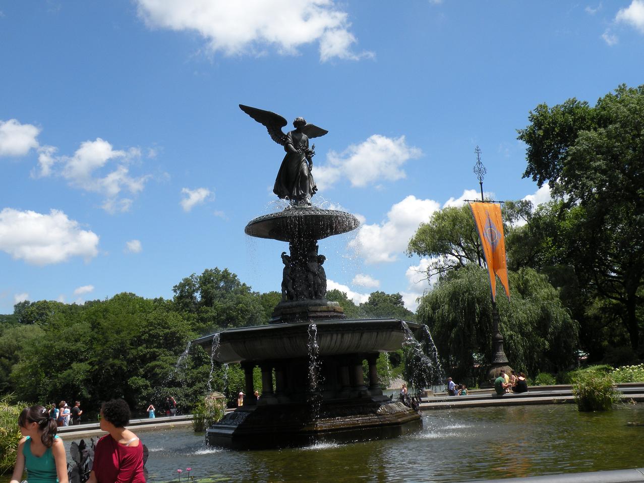 畢士達(dá)噴泉 (Bethesda Fountain) 及廣場(chǎng)位于湖泊與林蔭之間,是中央公園的核心,噴泉建于 1873 年,為了紀(jì)念內(nèi)戰(zhàn)期間死于海中的戰(zhàn)士,而畢士達(dá)之名則是取自圣經(jīng)的故事,內(nèi)容敘述在耶路撒冷的一個(gè)水池因天使賦予的力量,而具有治病的功效,“水中天使” (The Anger of Water) 的雕像,則是取自 Tony Kushner 的史詩(shī)戲劇作品“天使在美國(guó)” (Anger in America) ,而圍在噴泉旁的四座雕像分別代表“節(jié)制”、“純凈”、“健康”與“和平”。這座水池常常有成群天鵝悠游其間,也有不少游客在湖中劃船。